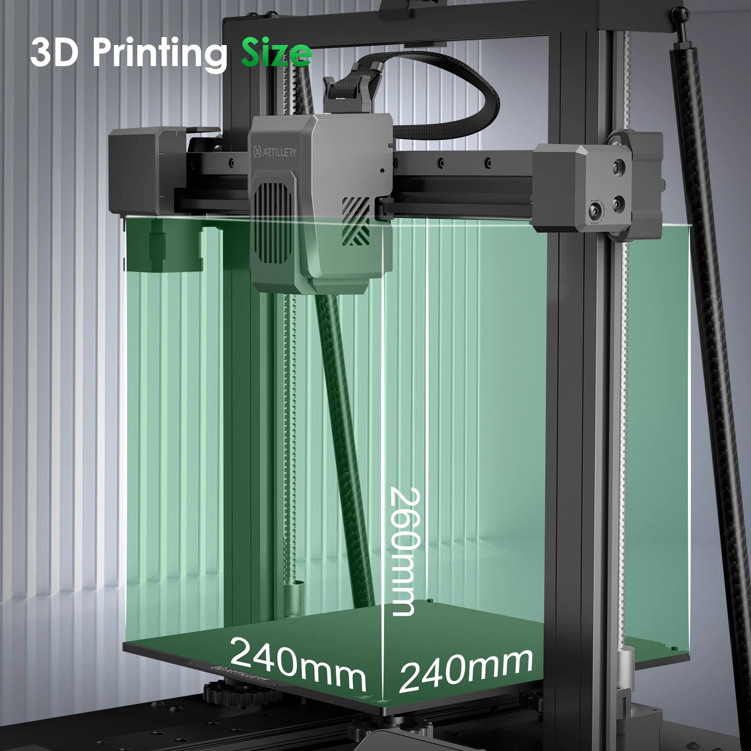 La Artillery Sidewinder X4 PRO ofrece un volumen de impresión de 240 x 240 x 260 mm, velocidad de hasta 500 mm/s, y una extrusión precisa con su extrusora Direct Drive de doble engranaje.