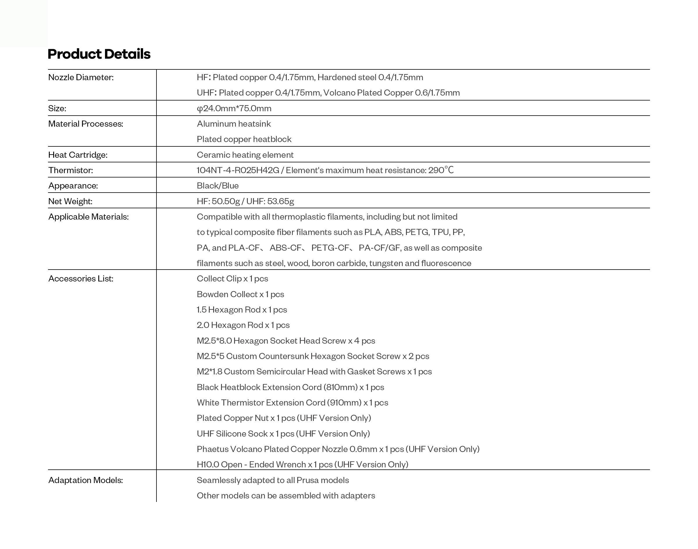 - Rapid Hotend UHF (Ultra High Flow):La versión UHF del Rapido Hotend está equipada con una boquilla Volcano y una boquilla V6. Se proporciona un adaptador para cambiar la boquilla.