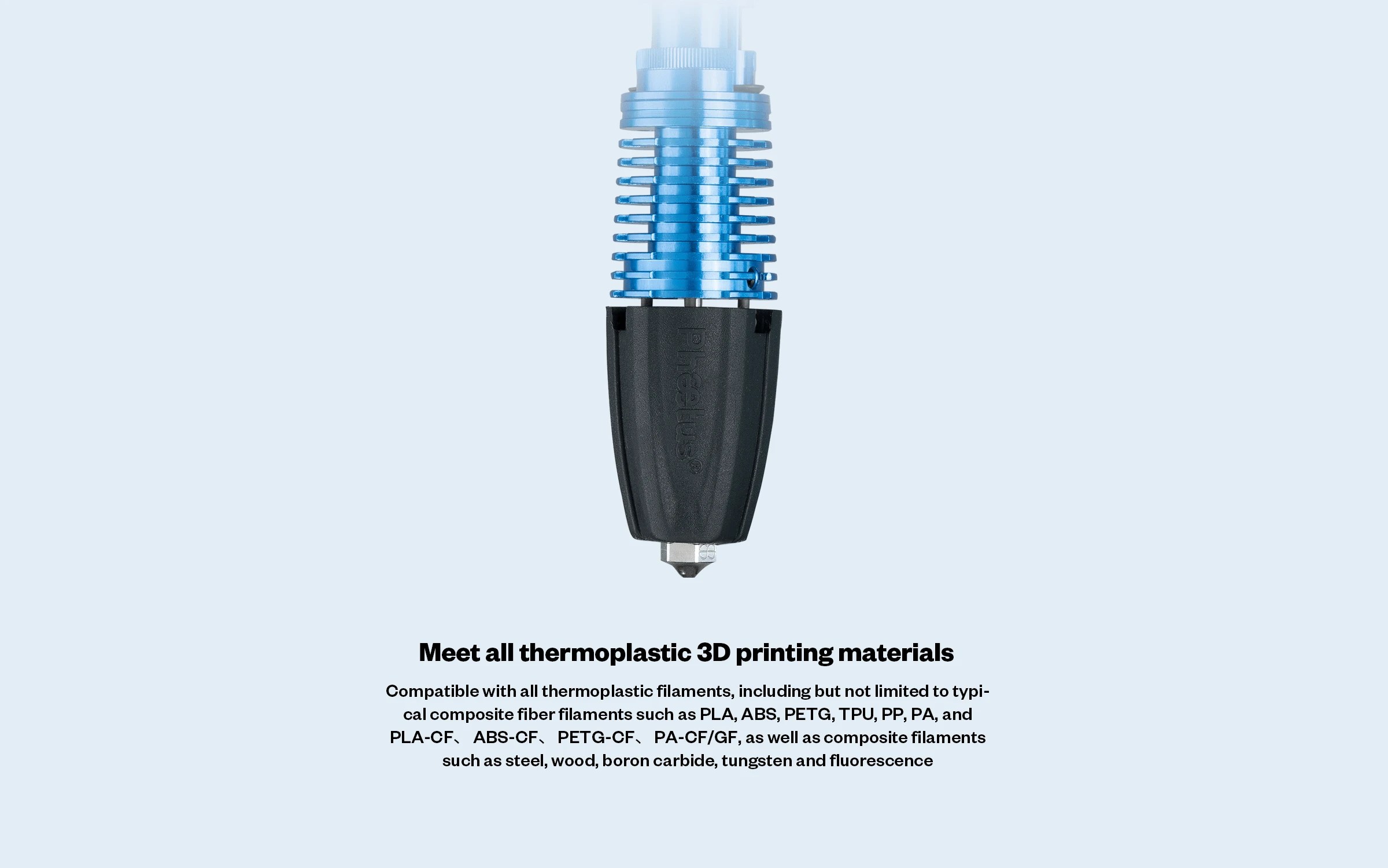 El hot-end es compatible con todos los filamentos termoplásticos, incluidos los filamentos compuestos típicos con fibras como PLA, ABS, PETG, TPU, PP, PA y PLA-CF, ABS-CF, PETG-CF, PA -CF / GF, así como filamentos compuestos como acero, madera, carburo de boro, tungsteno y fluorescentes.